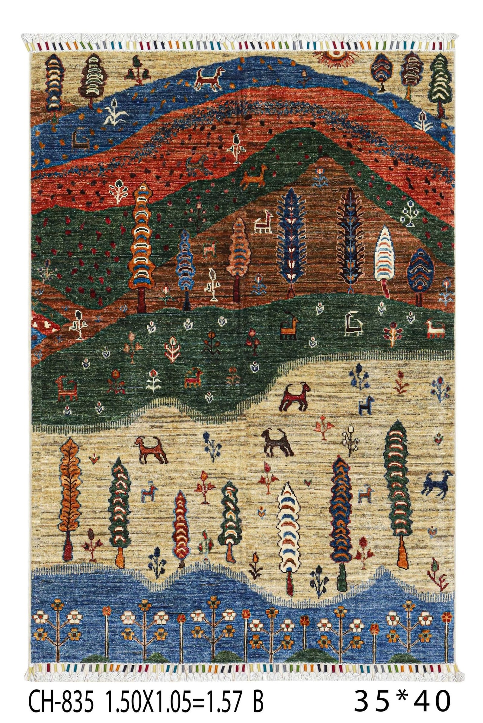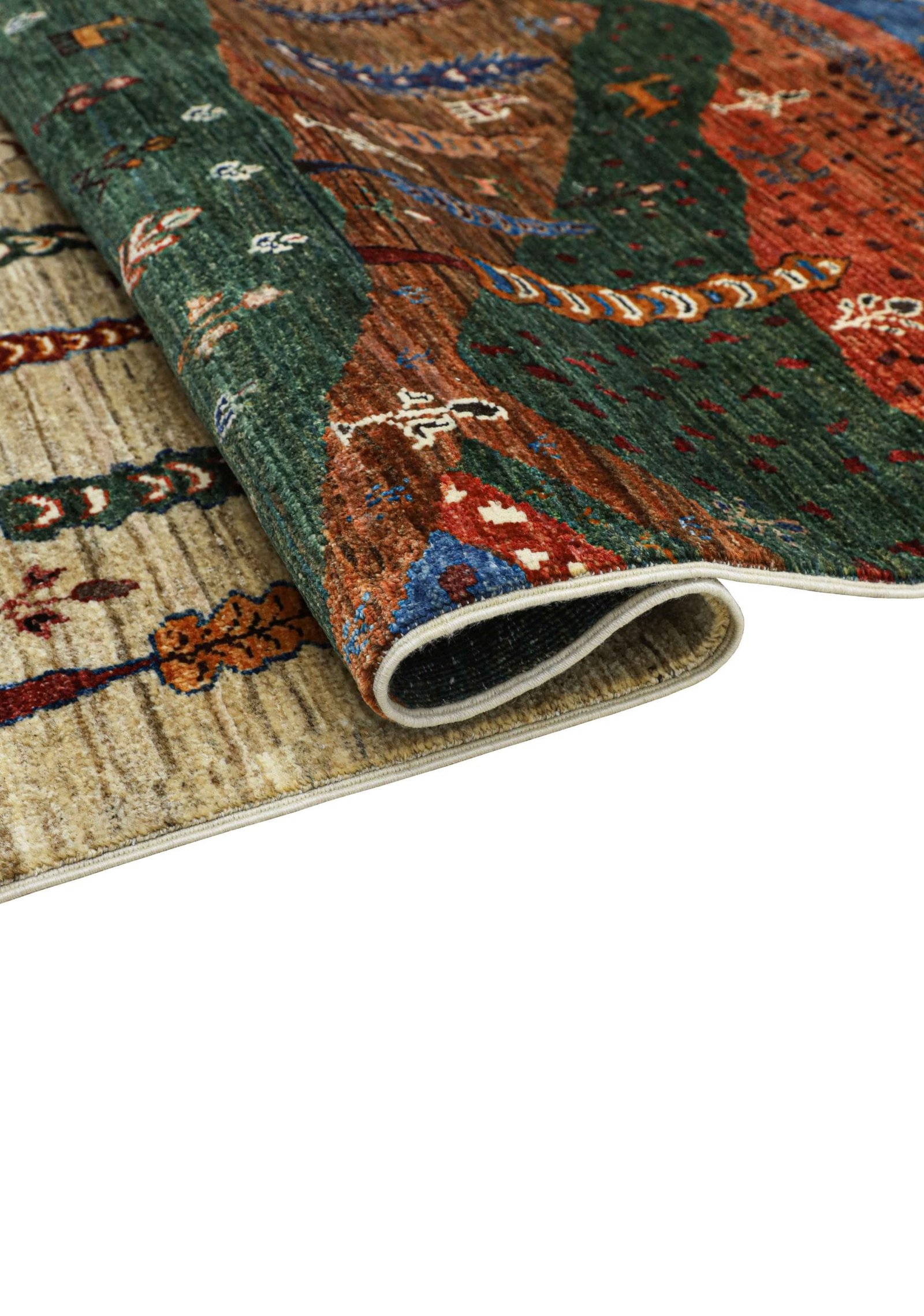 Featuring a breathtaking landscape design, the rug depicts rolling hills, vibrant trees, flora, and fauna in a harmonious palette of earthy tones: creamy neutrals, deep greens, rich browns, warm salmon, and snowy whites.
