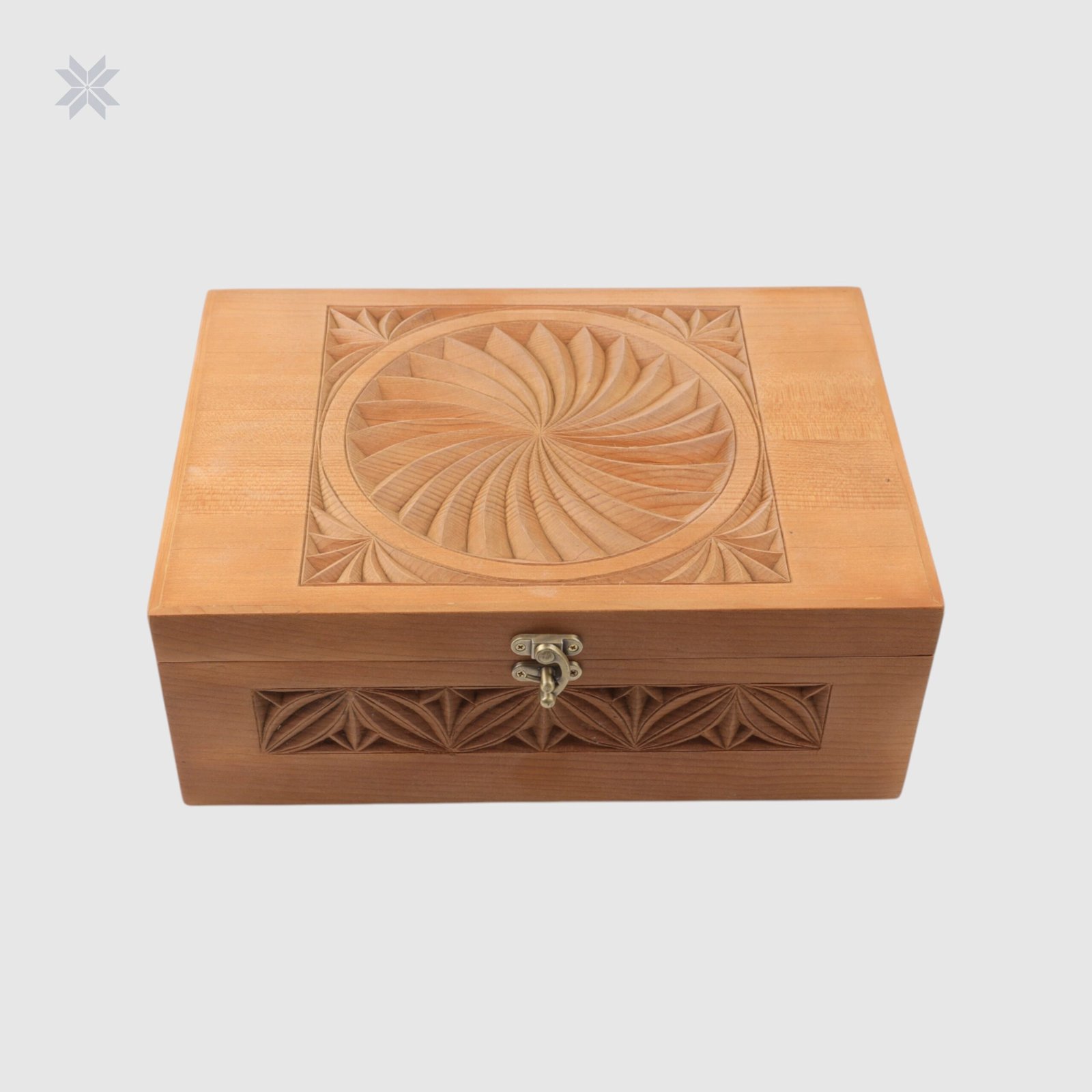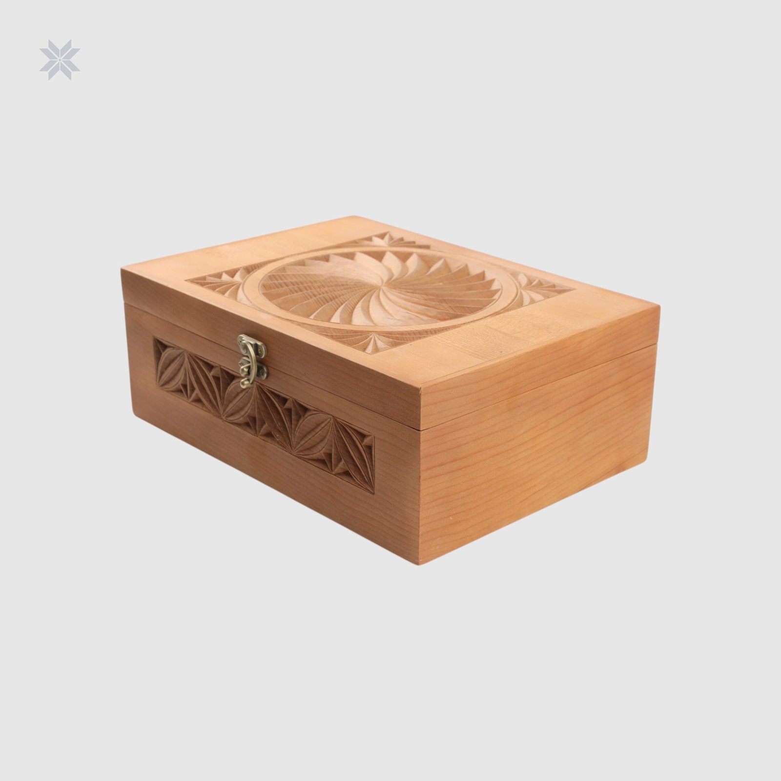 Add a touch of craftsmanship to your space with this handcrafted wooden jewelry box. Featuring intricate Nooristani carving, this box is perfect for keeping your precious items safe and beautifully organized.